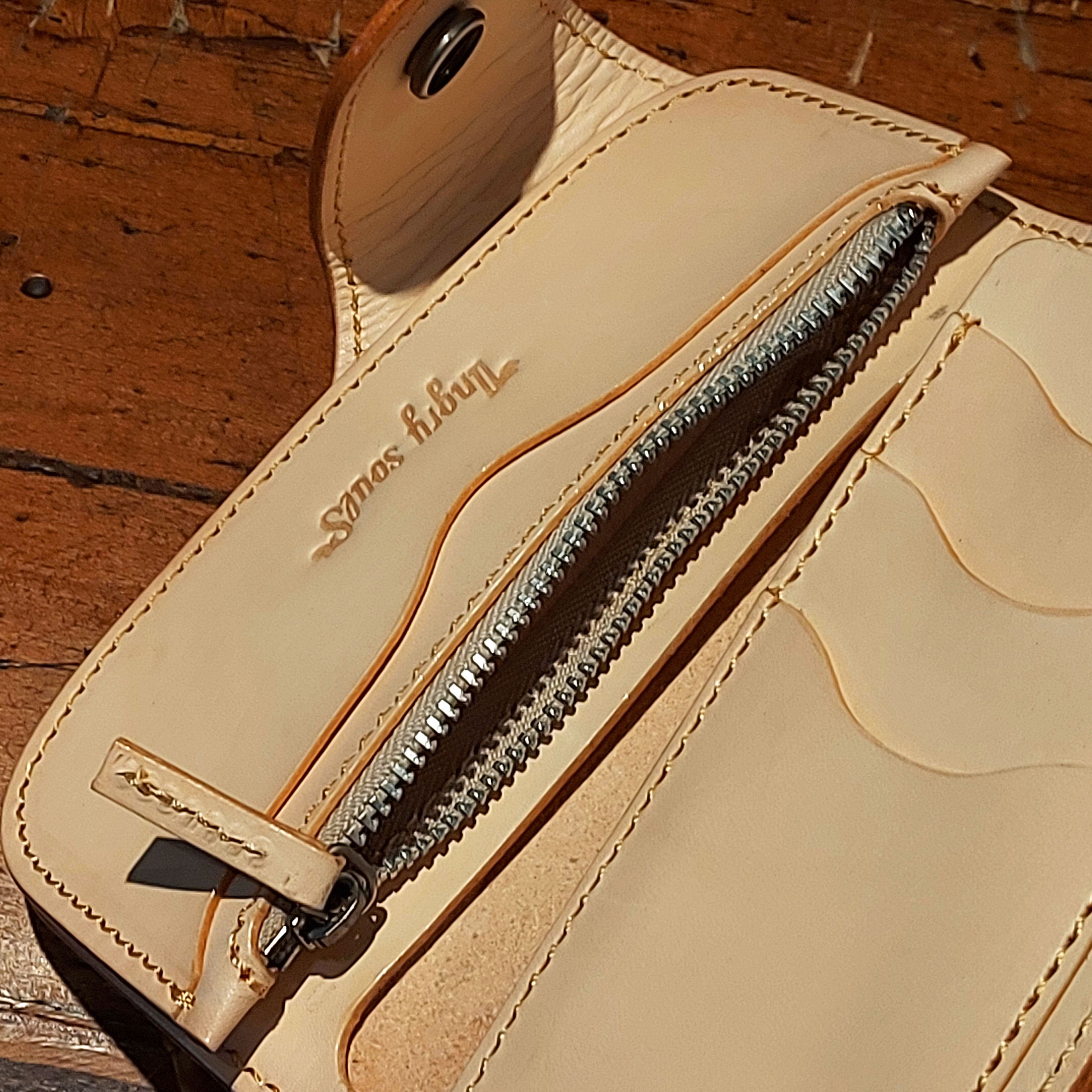 This leather long wallet by Angry Souls is a premium accessory, crafted by us using the highest quality materials to ensure both durability and elegance. Designed with a sleek, full-length closure, it offers a sophisticated and practical way to carry your essentials. With cards and zipper pocket. The rich leather is complemented by exquisite stitching and refined details, vegetable tanned, making this wallet a timeless piece for those who appreciate exceptional craftsmanship and understated luxury.