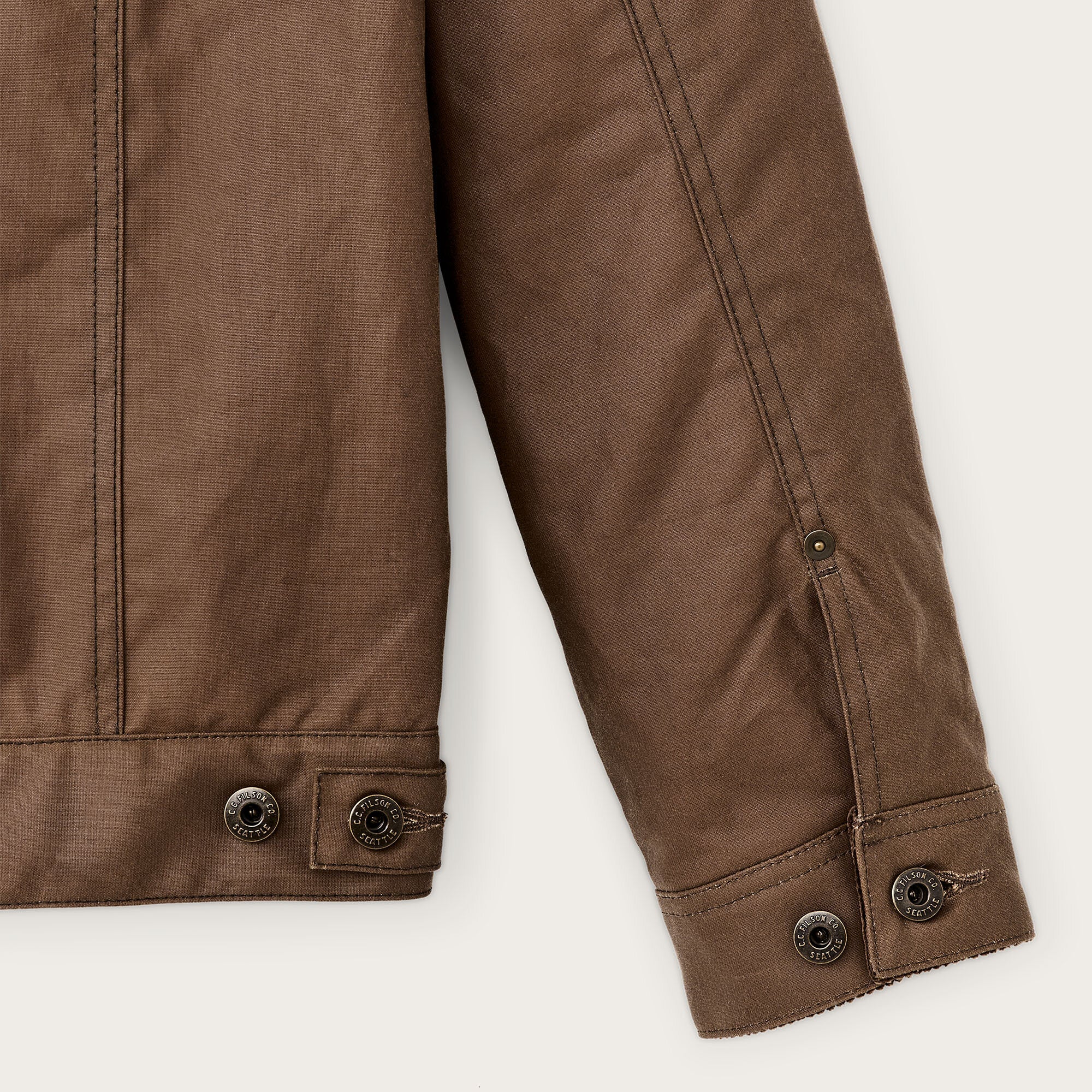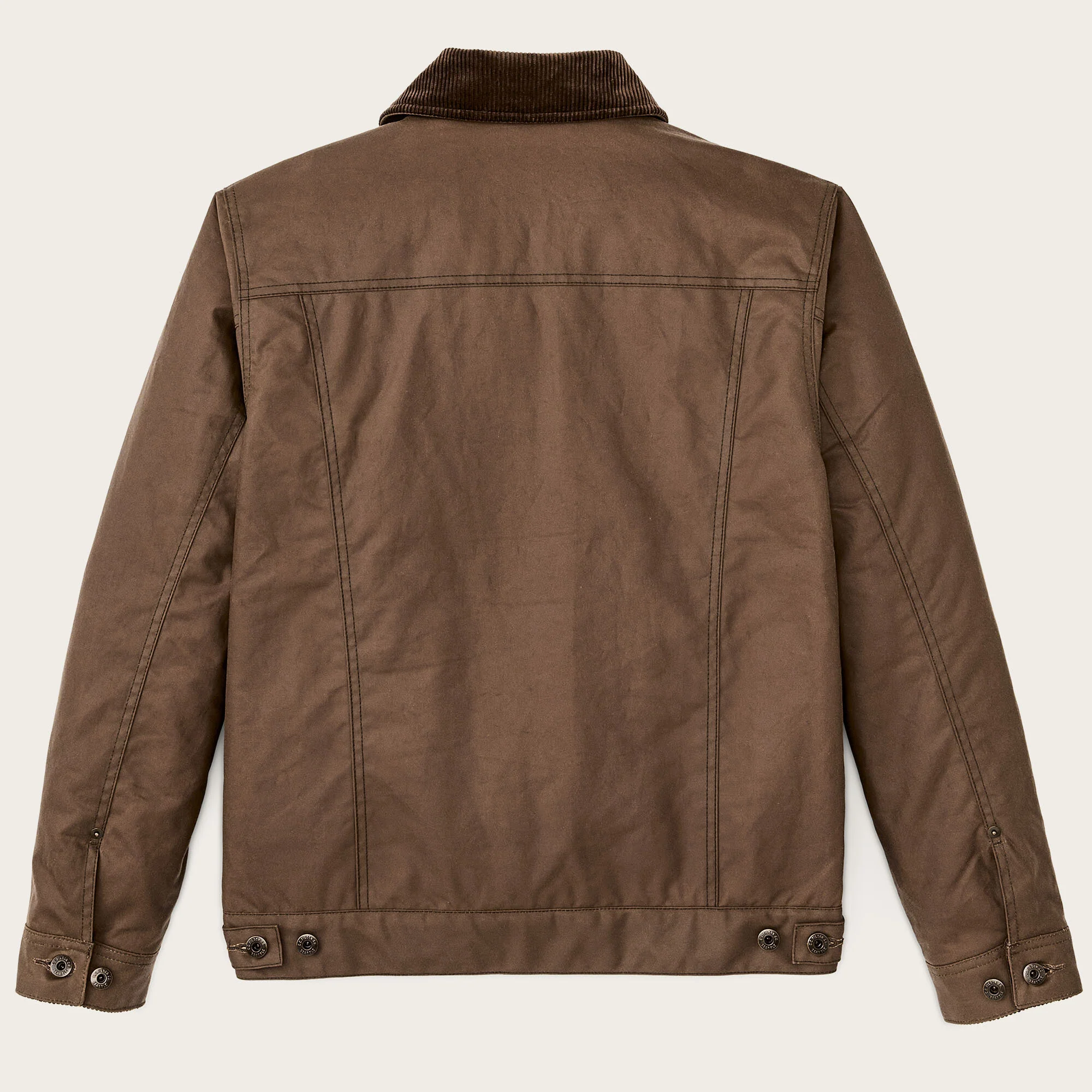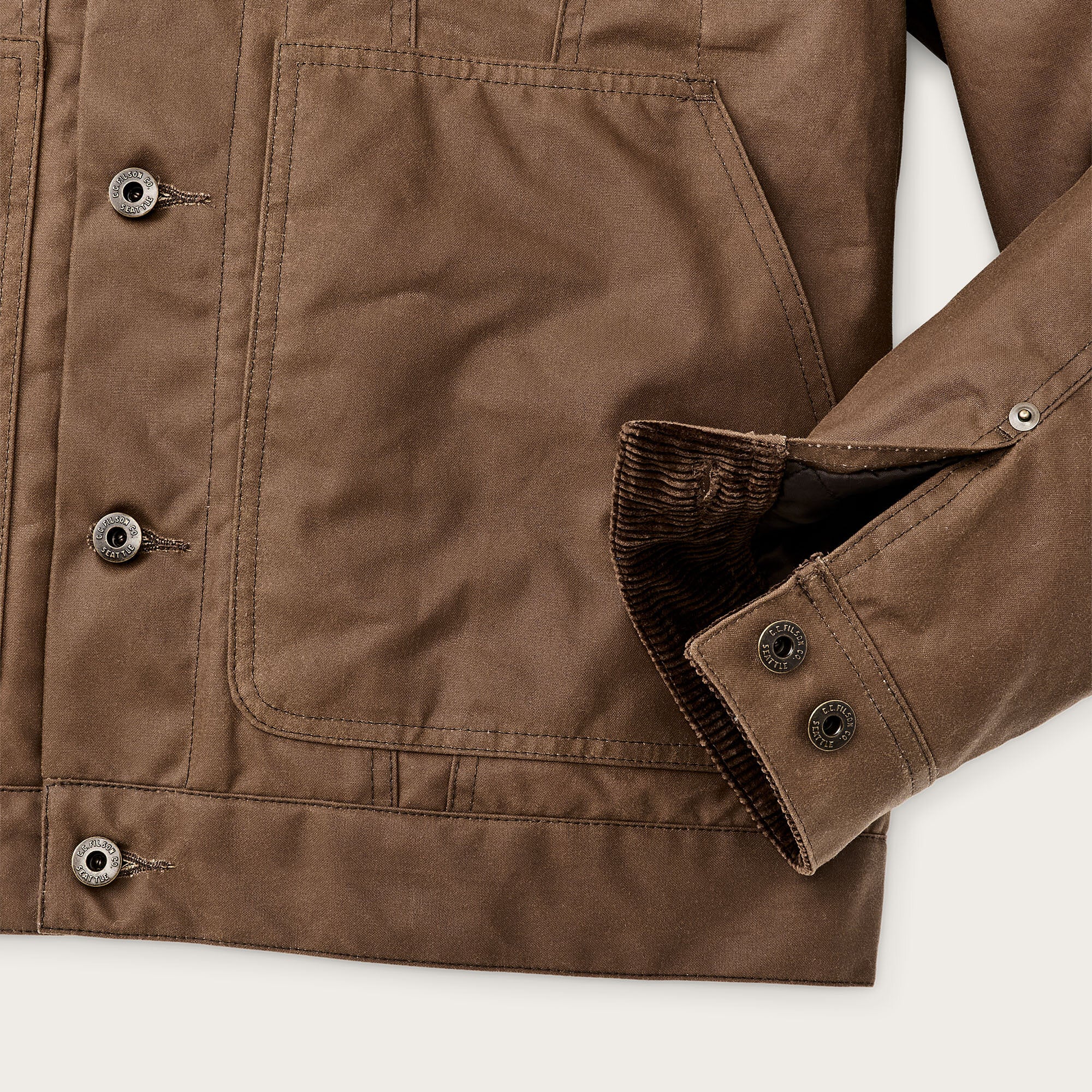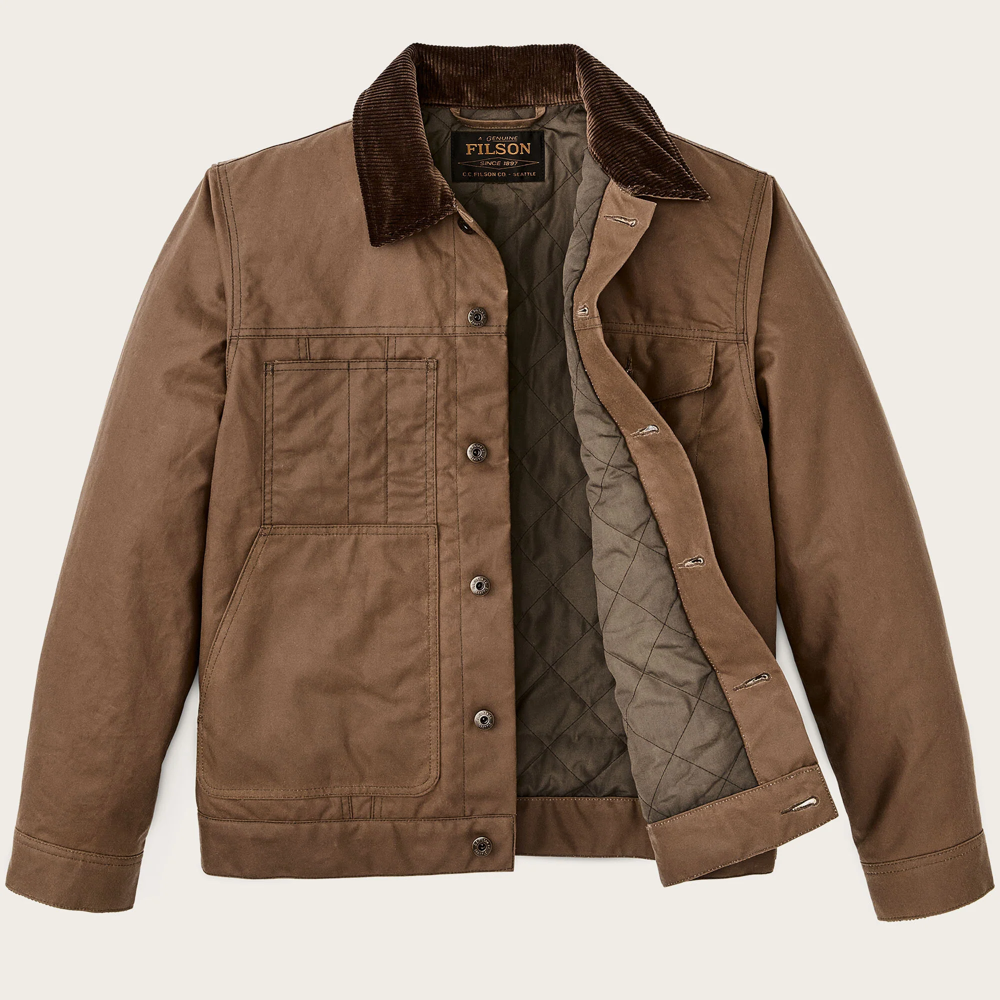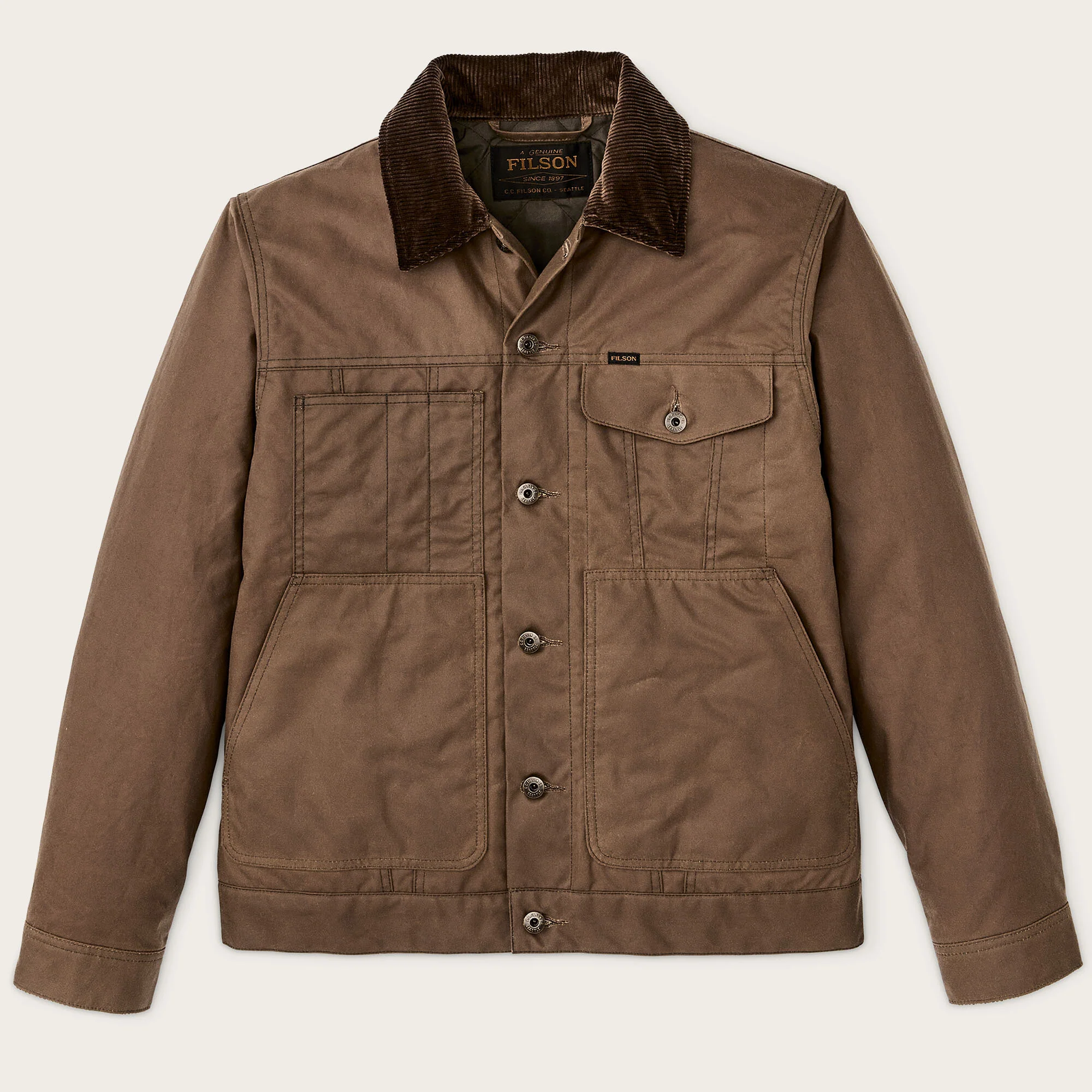 The Insulated Short Cruiser is made with our signature Shelter Cloth waxed cotton. At 11-oz. per square yard, this fabric is midweight for Filson, yet still heavier-duty than its imitators. Strong and flexible, Shelter Cloth comes from England’s famed British Millerain, waxed-cotton pioneers since 1880. The PrimaLoft® insulation is lightweight and will continue to trap heat even if it gets wet. The collar and cuffs are lined with 100% cotton corduroy for comfort against the skin. Virtually unbreakable metal-shank buttons secure the front closure and waist-adjustment tabs. Large hand pockets plus flapped and slotted chest pockets.