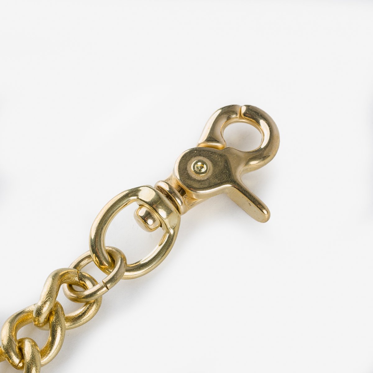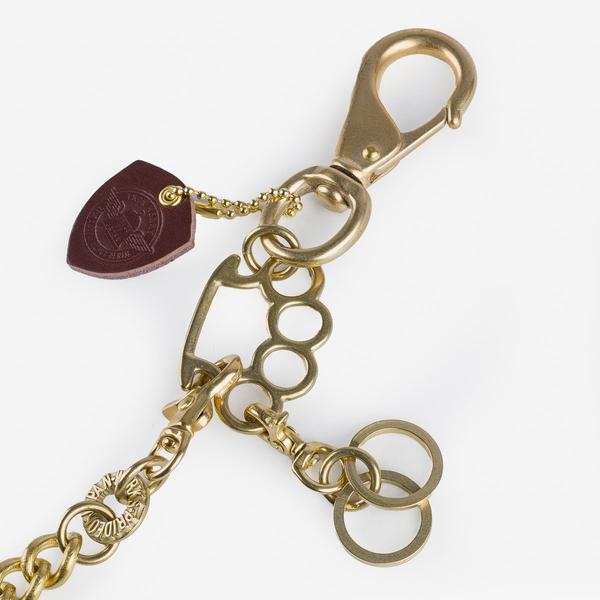 A rugged, solid brass wallet and key chain, incorporating an embossed “Iron Heart Pride Of Japan” zinc-alloy connecting ring. This model features a large belt loop clasp, decorative brass knuckles, and a swivel lobster-claw clasp for attaching to a wallet. In addition to this, a smaller clasp and three split rings allow for a secure connection and easy access to your keys.
