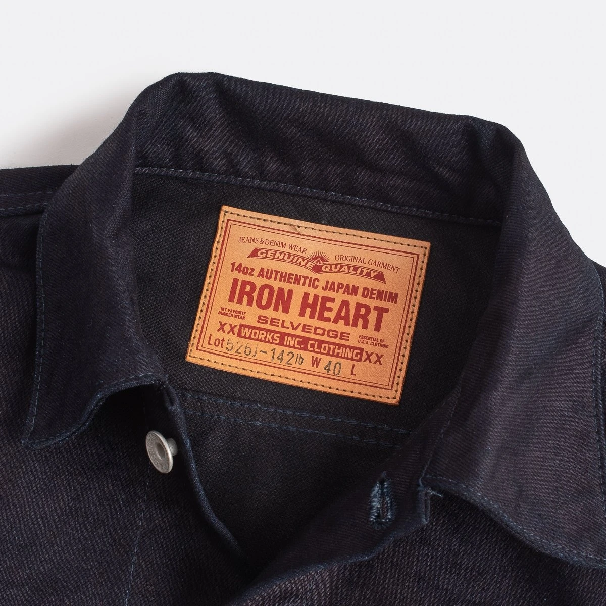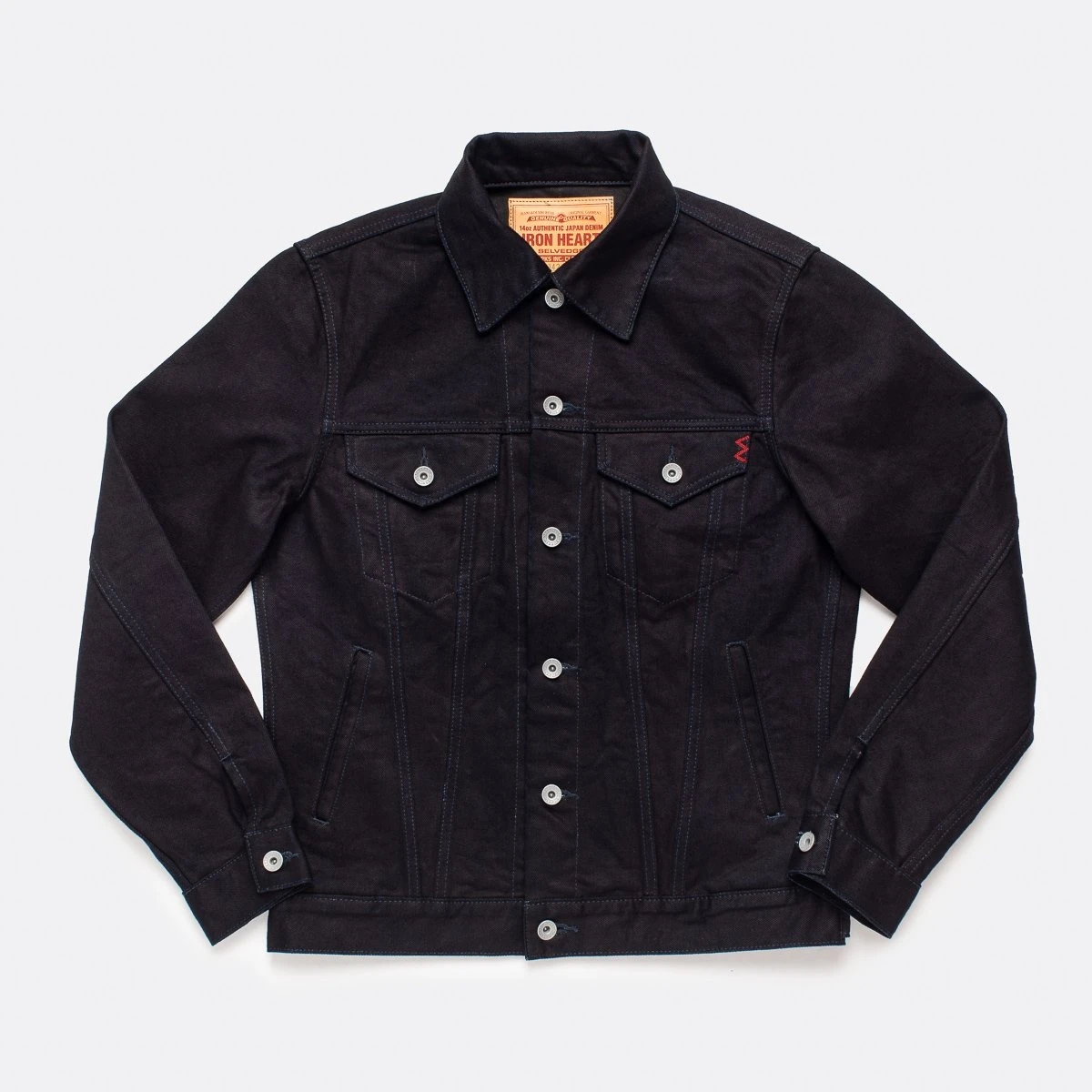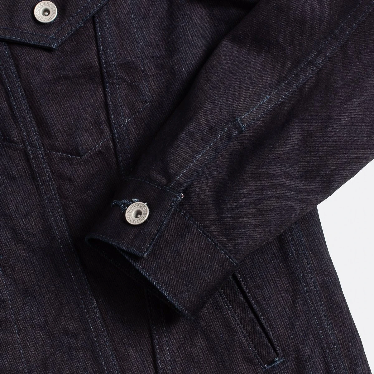 Our classic Type III jacket, modified with a slightly longer than traditional body and with the addition of side handwarmer pockets, made from our 14oz indigo/black selvedge denim (second version which is made with a double twisted weft yarn, the same construction technique as our 21oz selvedge denim).