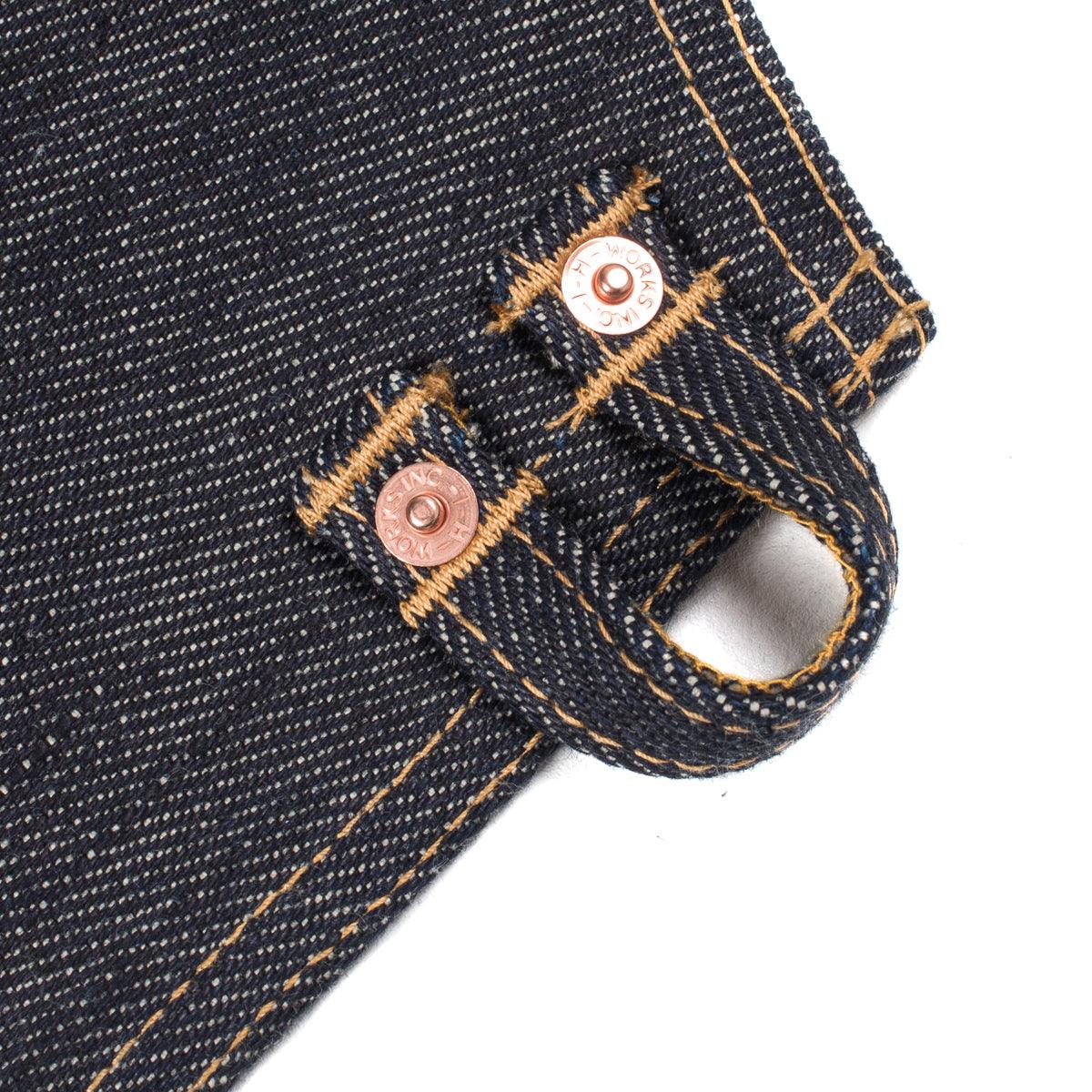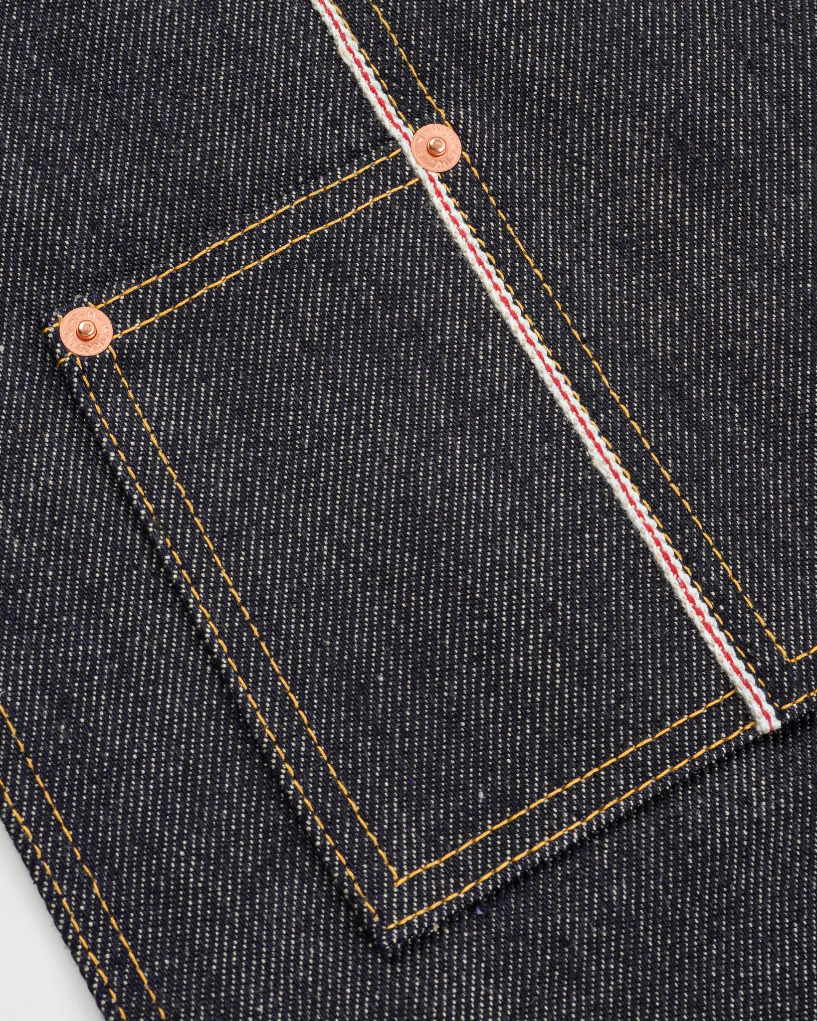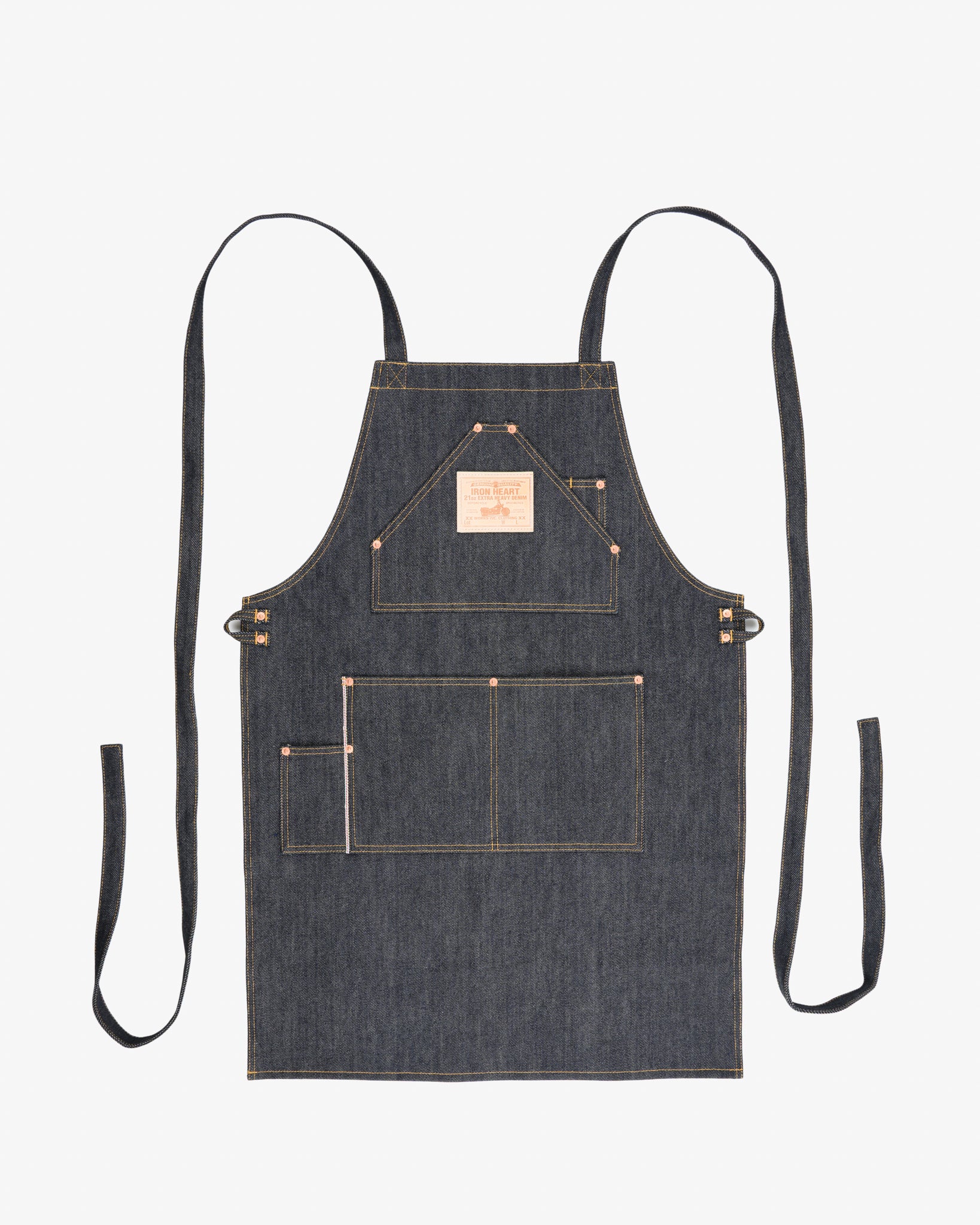 Made from 21oz selvedge denim, this full-length bib apron offers hard-wearing protection, practical features and classic workwear styling. Versatile pockets include a kangaroo-style chest pouch with dual pen slots and two large waist pockets, finished with heavy-duty straps and tie loops. Constructed using the same over-engineered techniques as Iron Heart’s heavyweight jeans, all pockets are reinforced with brass rivets and stitched with high-tensile poly/cotton thread.