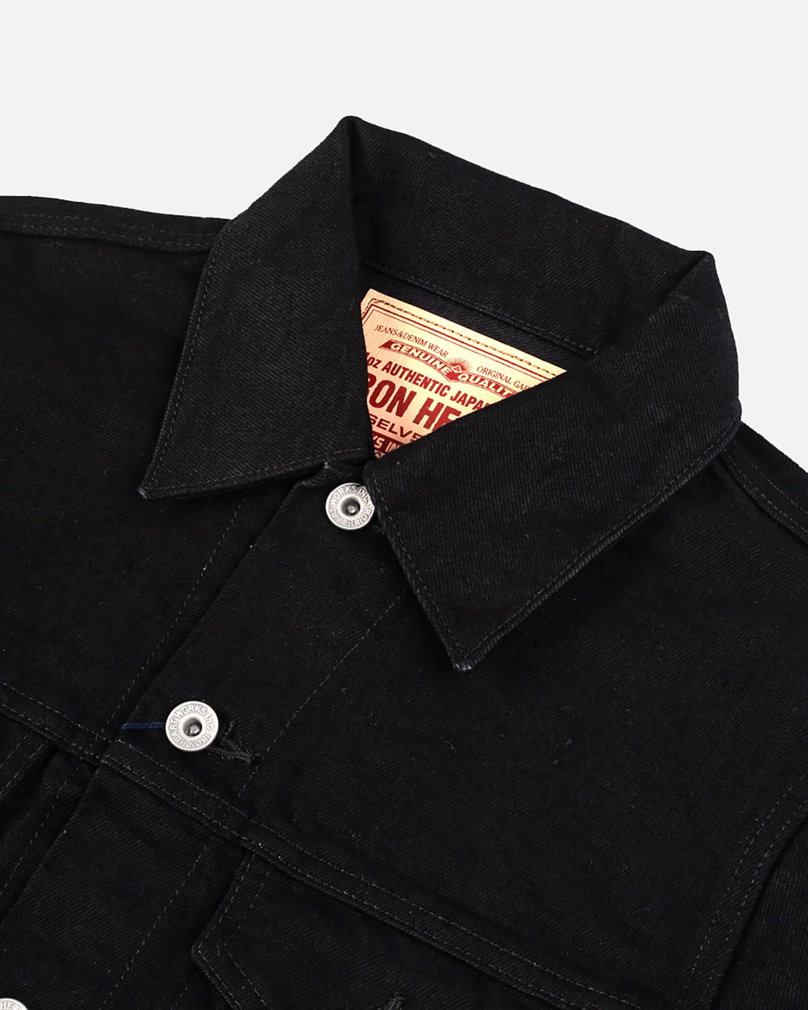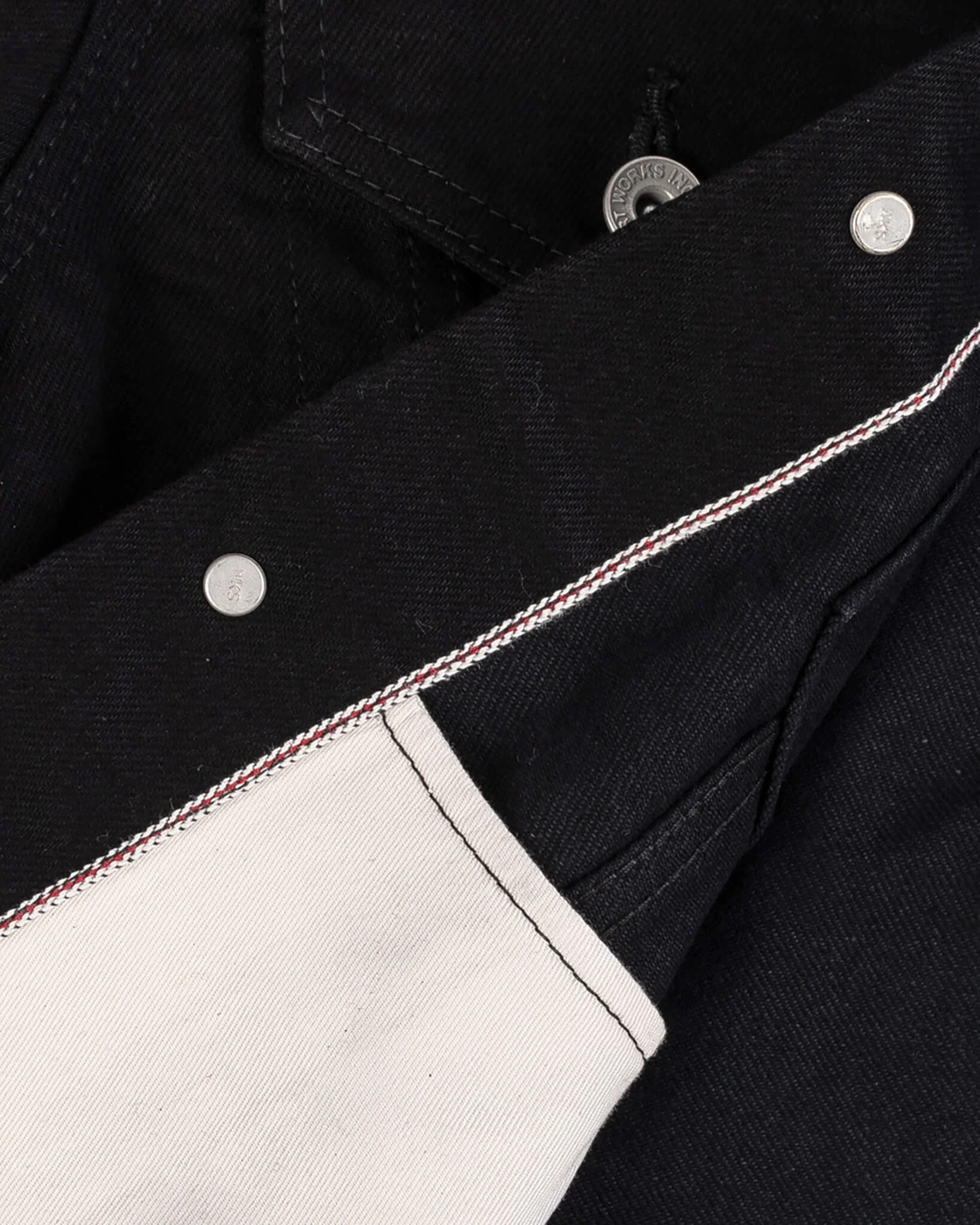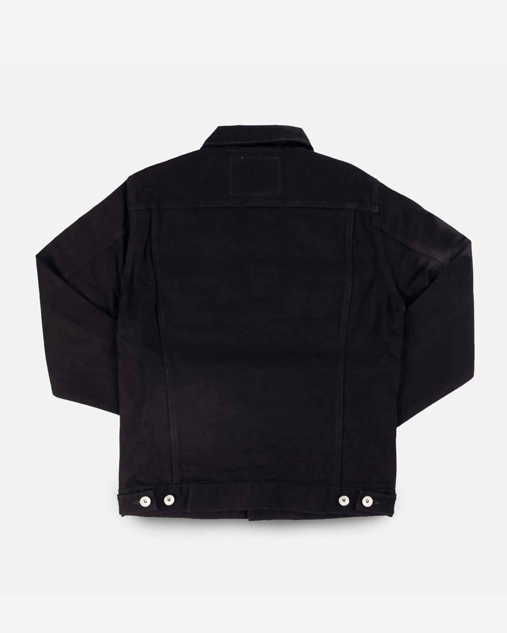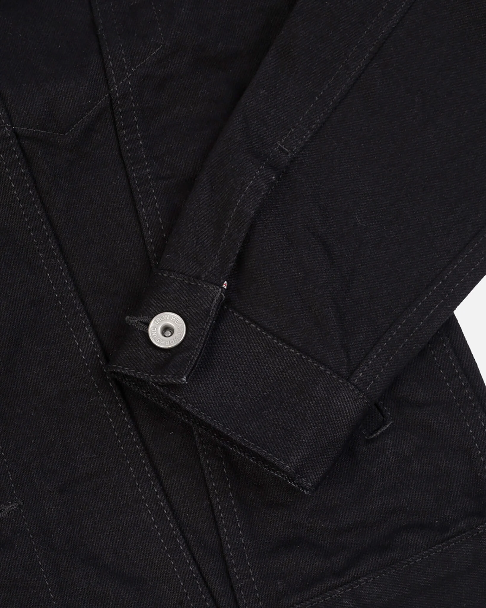 Our classic Type III jacket, modified with a slightly longer than traditional body and with the addition of side handwarmer pockets, made from our 14oz black/black selvedge denim. The warp is black sulphur rope dyed, the weft is black sulphur dipped. Constructed with black tonal stitching. Will fade to grey.