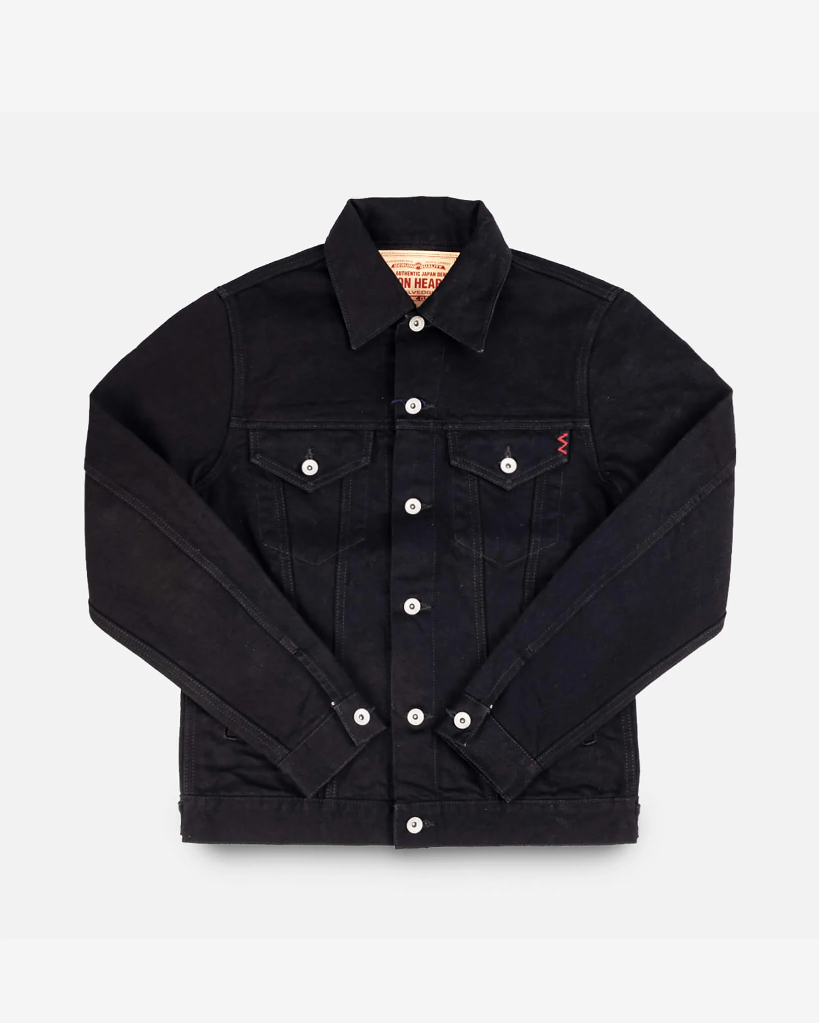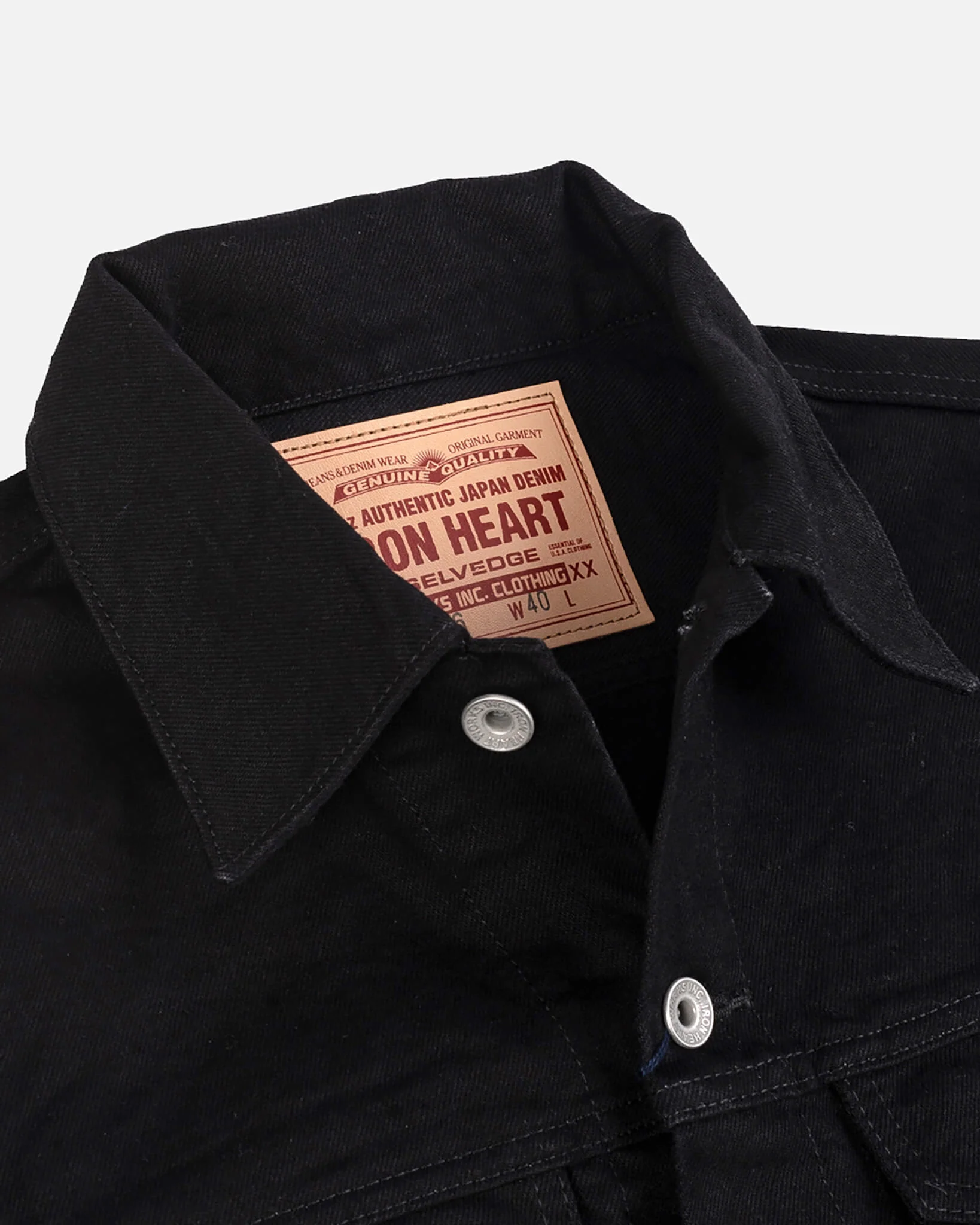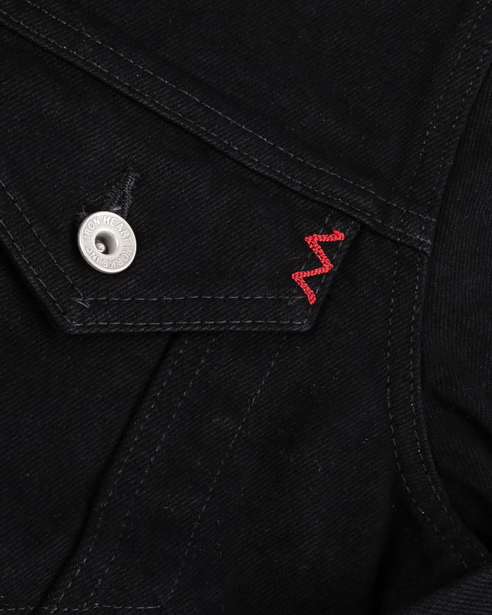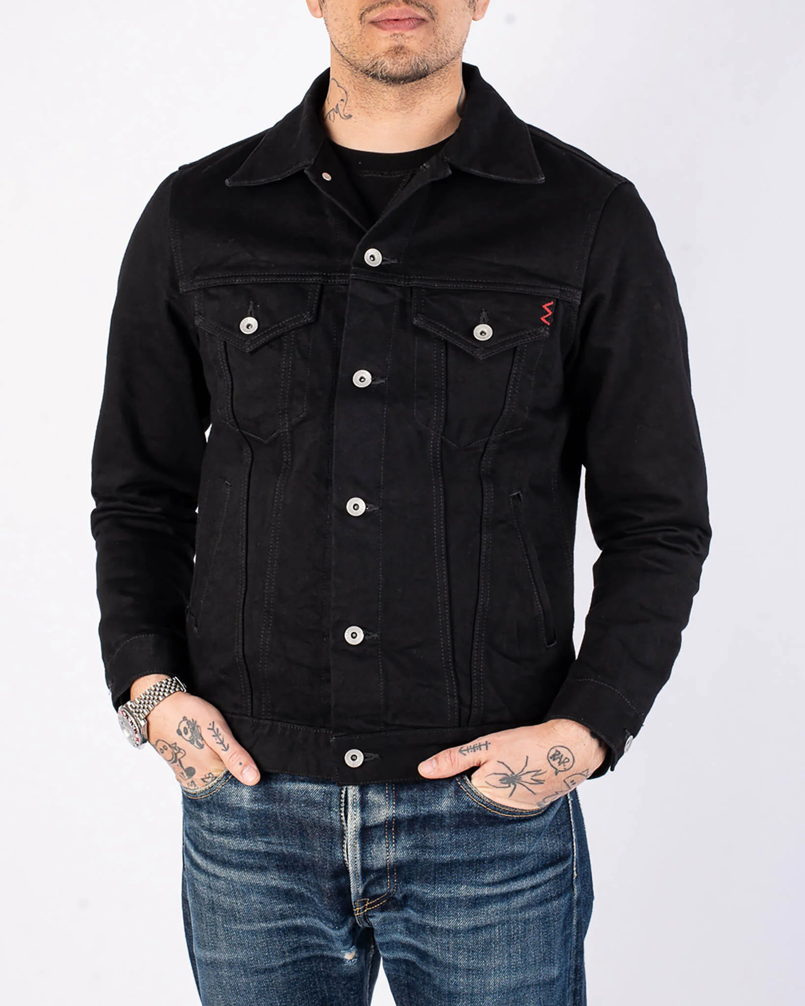 Our classic Type III jacket, modified with a slightly longer than traditional body and with the addition of side handwarmer pockets, made from our 14oz black/black selvedge denim. The warp is black sulphur rope dyed, the weft is black sulphur dipped. Constructed with black tonal stitching. Will fade to grey.