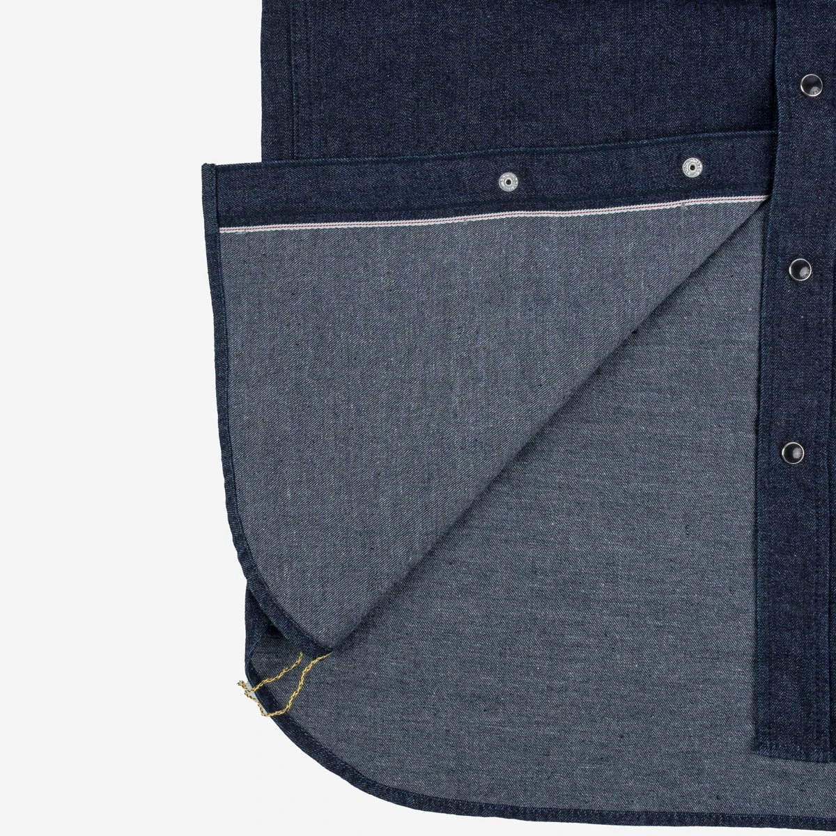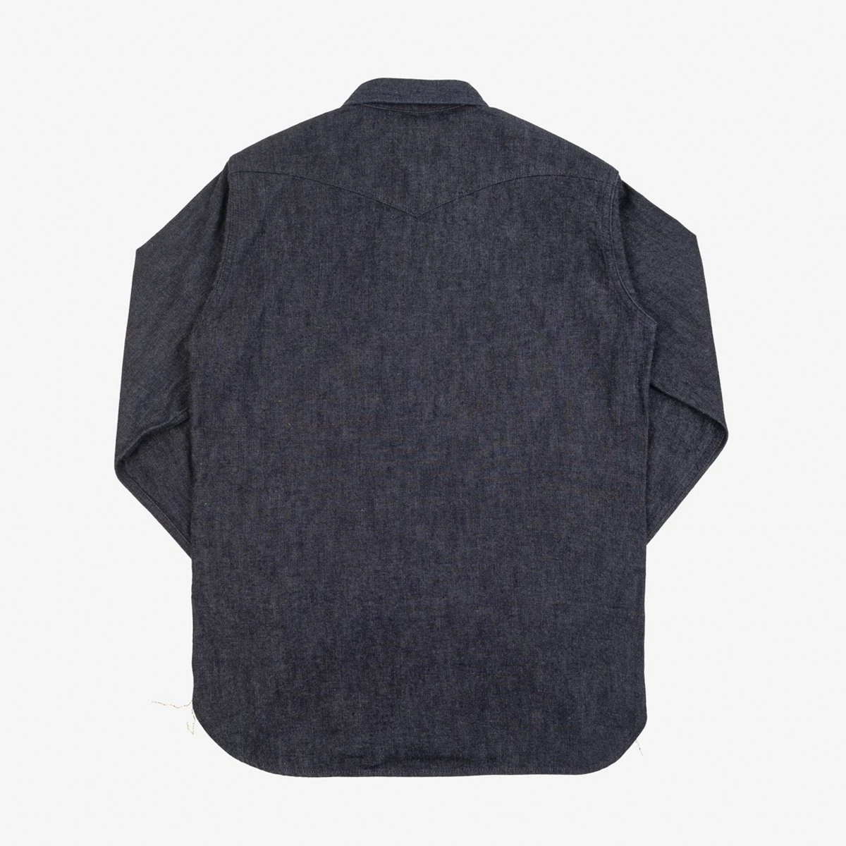 Our classic western shirt, constructed from an indigo rope dyed warp and a grey weft, woven in a 2×1 twill, which creates a fabric reminiscent of early Works Inc. style fabrics. As this denim ages and the indigo rope dye leeches from the fabric, the grey weft becomes more prominent on the face of the denim, it will fade with a more muted tone than you will see with the more common white weft.