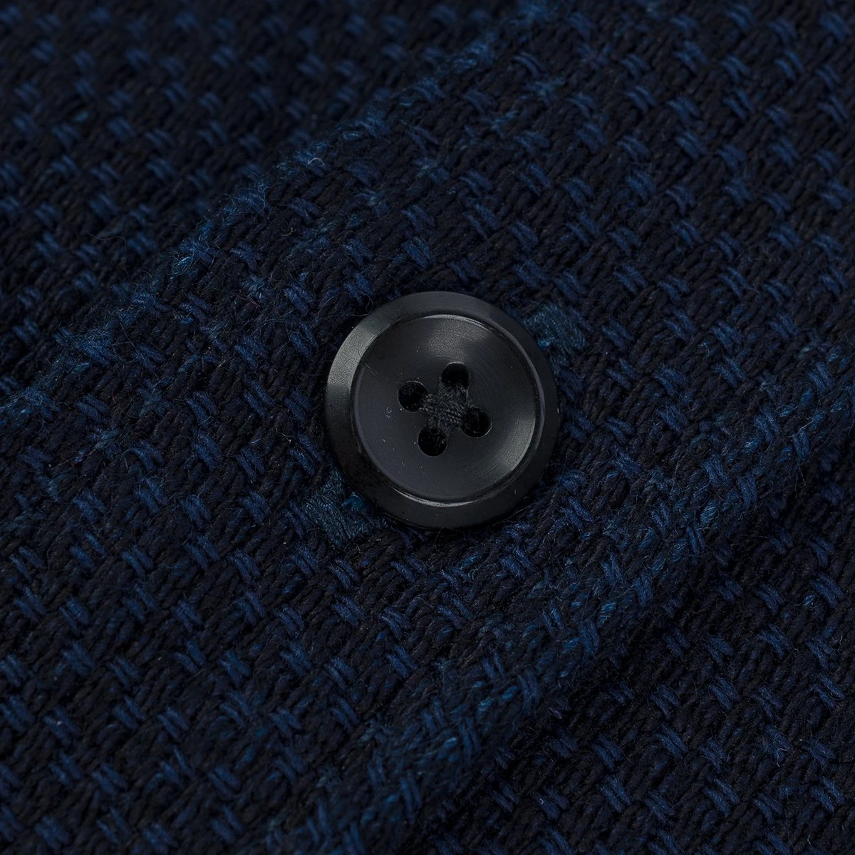 Our classic work shirt, made from a 12oz dobby loom woven cloth with Sashiko thread stitching. Dating back to the 17th century, Sashiko is a traditional form of Japanese folk embroidery used for both decorative and functional reinforcement of fabrics. With a translation meaning “little stabs”, the technique involves a running stitch which creates aesthetically pleasing geometric patterns in a piece of cloth, simultaneously reinforcing the weave for added durability. When intertwined with our heavyweight dobby cloth, the result is an incredibly intricate weave with a deeply textured, yet soft and pliable hand. A fabric full of character, the warp threads are indigo rope dyed – meaning that the colour will fade with wear and washing – whilst the weft yarns and Sashiko thread are cheese and reactive dyed respectively and won’t fade.