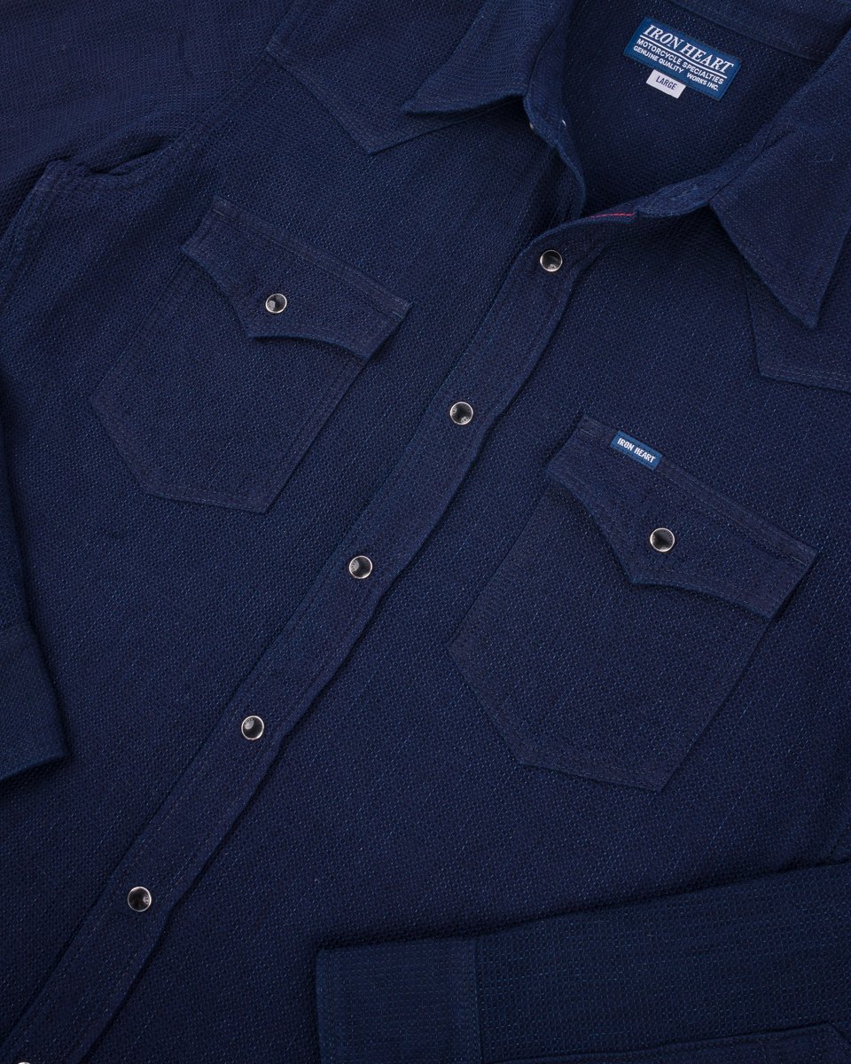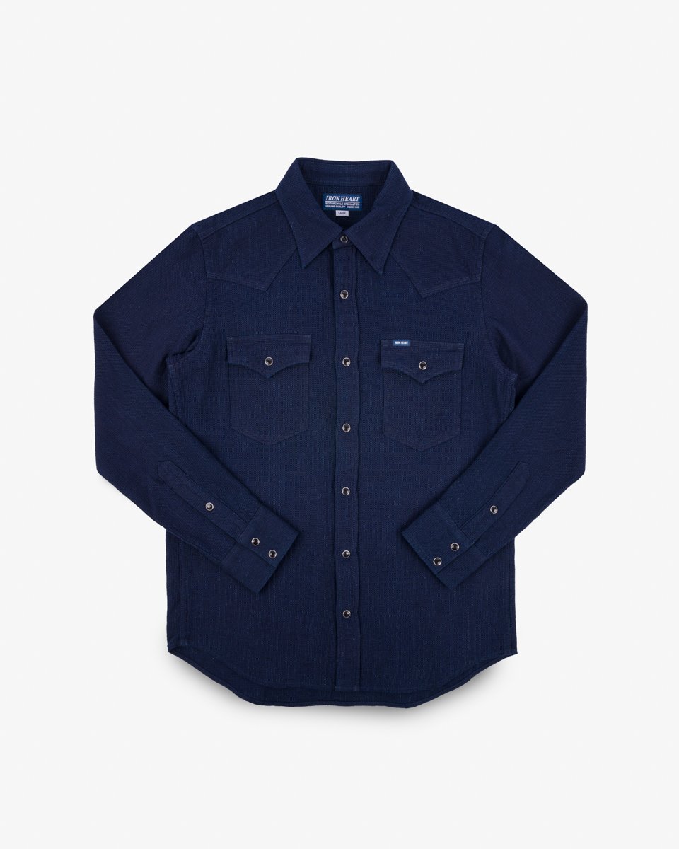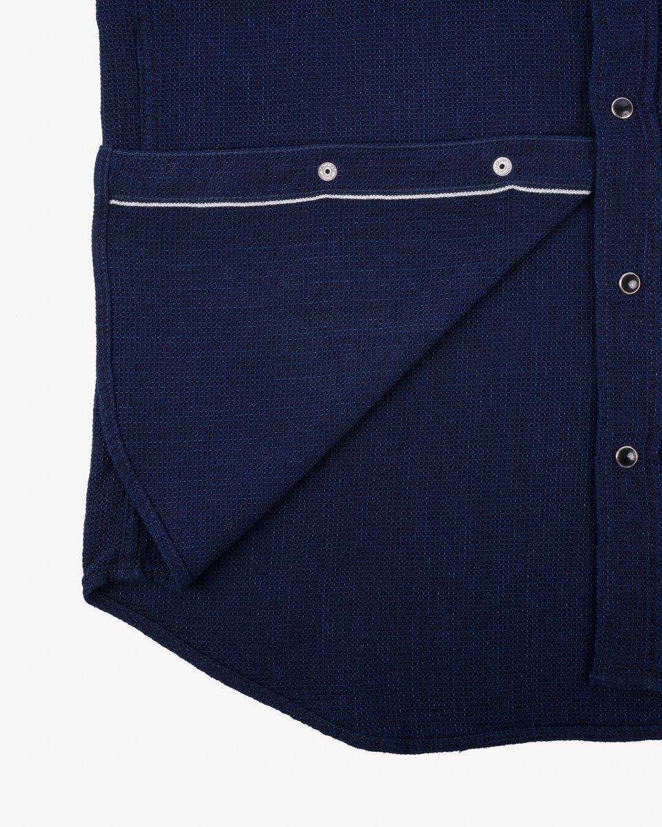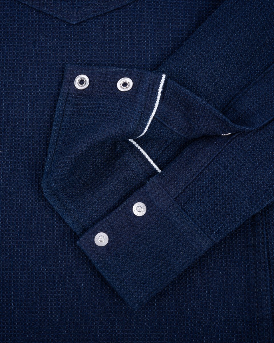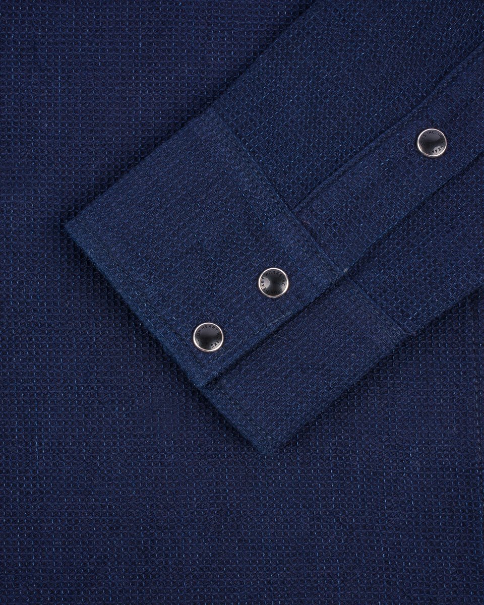 Ideal for warmer climates, this western-style shirt is made from a dobby loom woven 5oz selvedge cloth. Shuttle woven slowly and loosely, this lightweight fabric provides excellent ventilation with a soft, three-dimensional waffle-like texture. The origins of dobby cloth date back to the mid-1800s, and production methods have remained the same ever since. The technique involves attaching a piece of equipment known as a “dobby” to the loom, which is used to manipulate the yarns during weaving, creating subtle variations in the fabric’s texture. Indigo dyed to allow for fading through wear, this is a highly breathable shirt that brims with character.