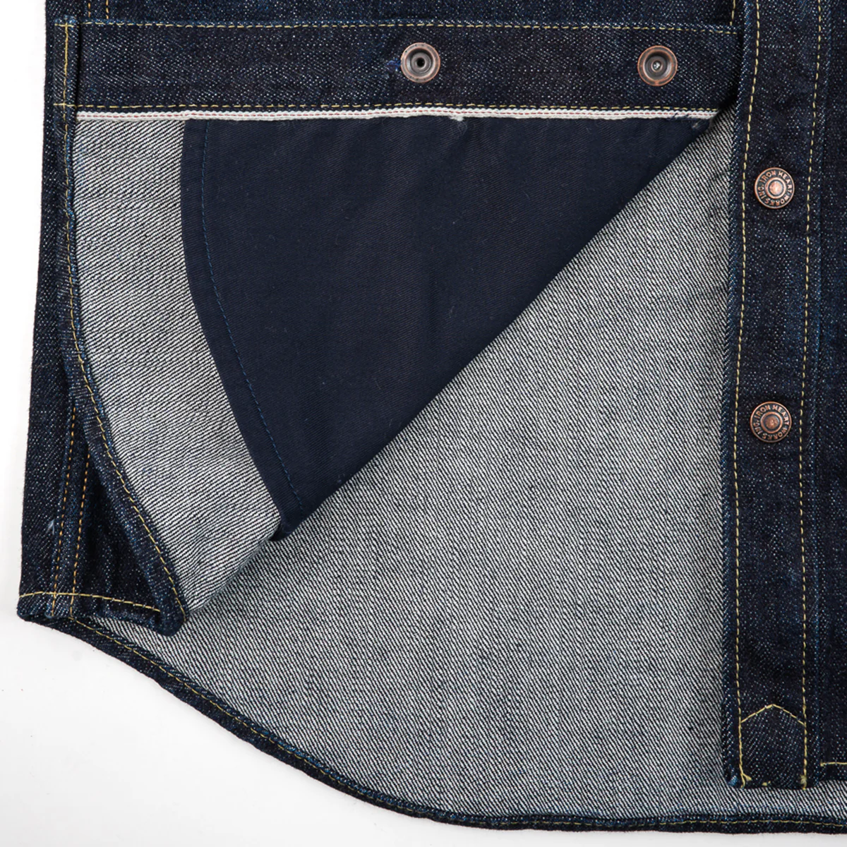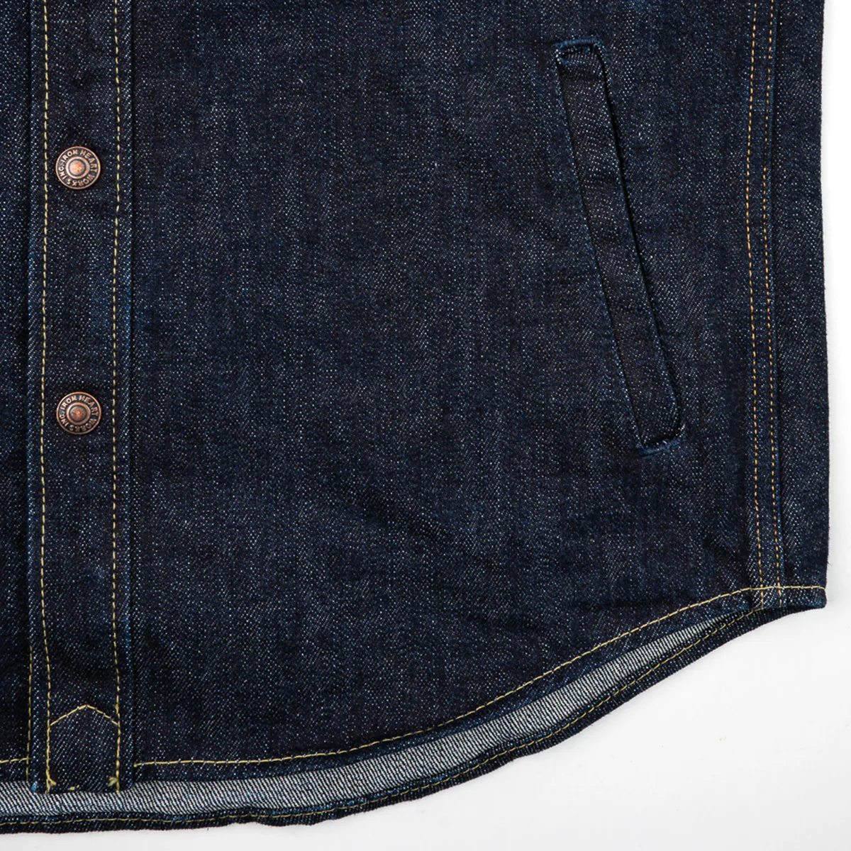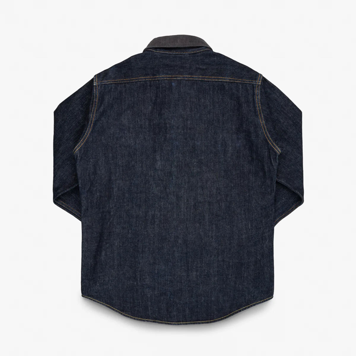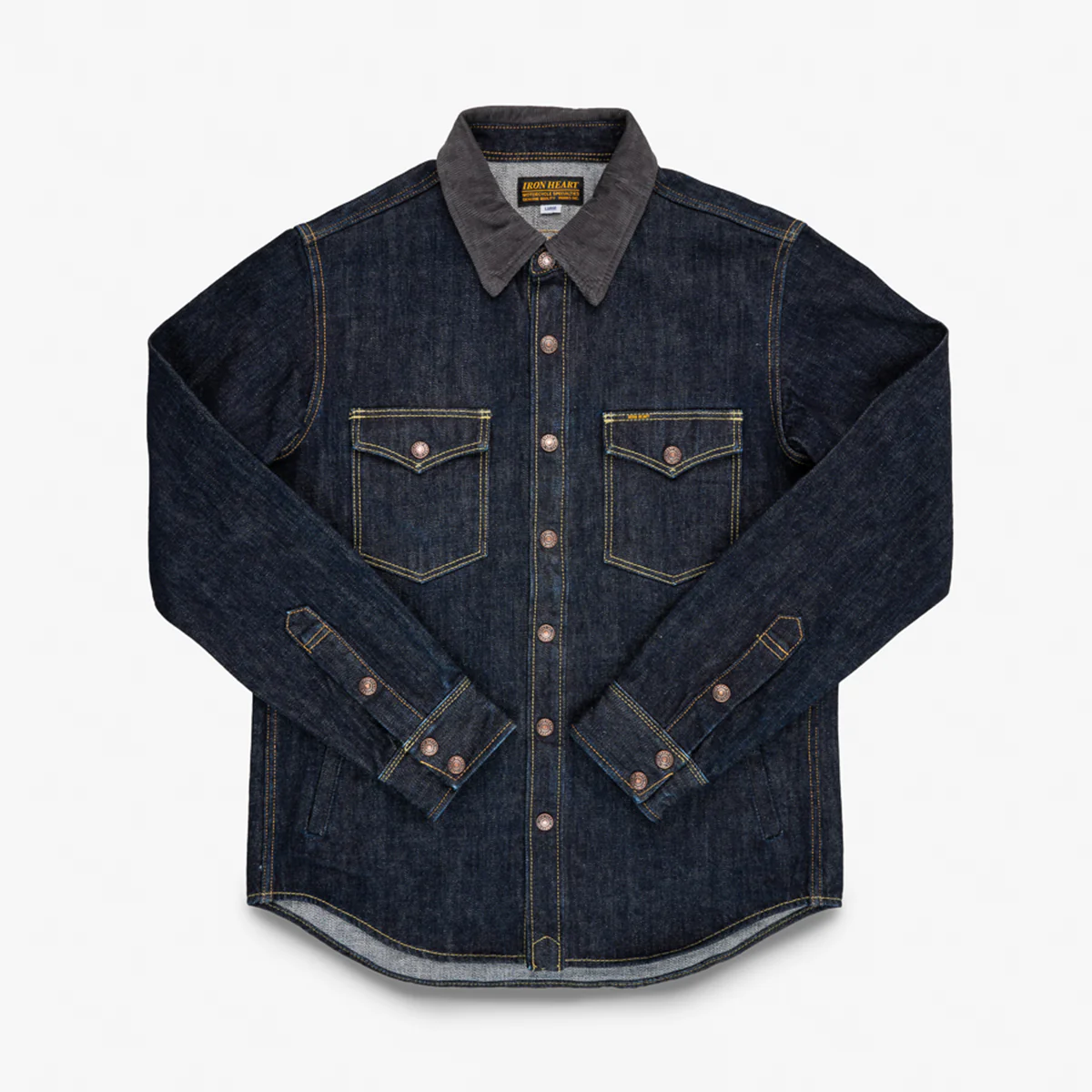 This Western CPO shirt is cut from new 16 oz. Japanese selvedge denim and finished with a corduroy collar. Iron Heart produced this vintage-style denim in collaboration with the centuries-old Takata Orimono mill in Kojima. The denim is woven using Pima cotton ringspun yarns, creating an uneven, slubby twill with lots of texture. Much like our 18 oz. vintage weave, expect this fabric to develop character-filled “tate-ochi” vertical fades as the denim evolves with wear. This CPO-cut shirt offers a little more length in the body than our standard Western-cut shirts. It has oversized copper snap fastenings and additional hand-warmer pockets for versatility. For this model, we chose to omit the Western-style front yokes and include only a straight rear yoke for a more contemporary look.