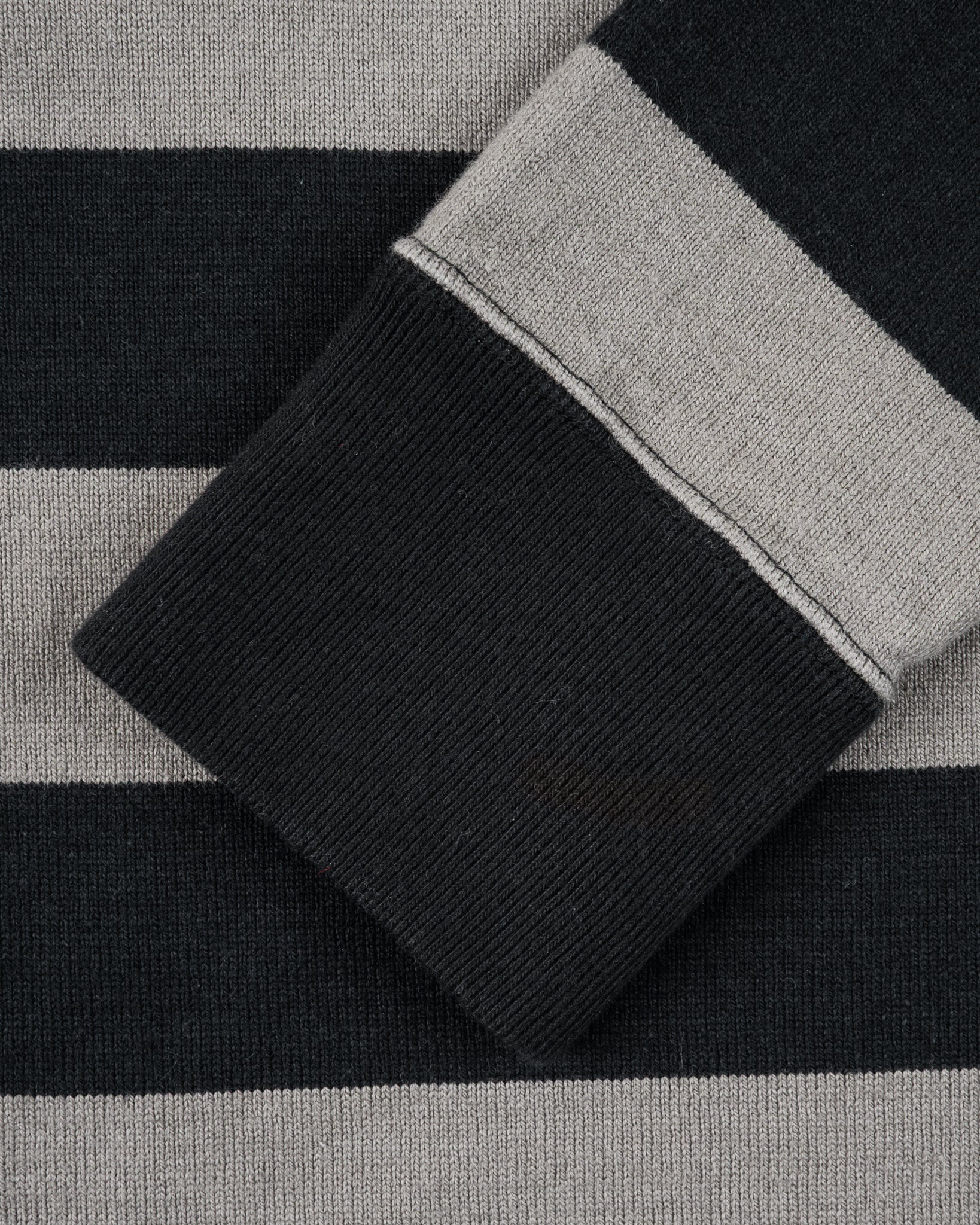 Heavyweight long-sleeved knitted cotton sweater with statement stripes. One-washed to minimize/eliminate shrinkage. So heavy, it’s almost rude to call it “just” a sweater.