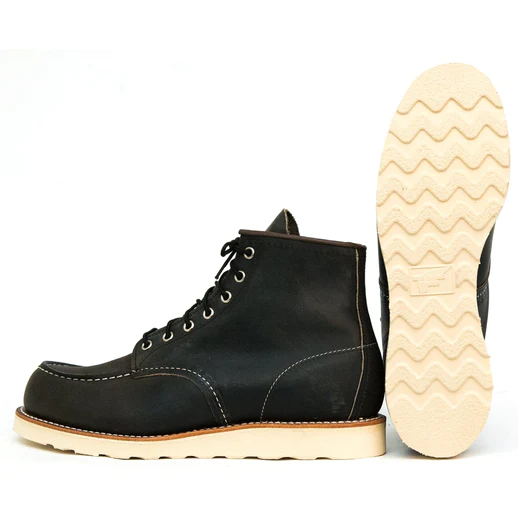 The Red Wing Shoes 8890 Classic Moc Toe in Charcoal Rough & Tough is a Classic Red Wing Shoes Mocassin style and is made in Red Wing, Minnesota. The Red Wing 6″ Moc Toe boot was originally designed for hunters and farmers in the early 1950s. The Red Wing Moc-toe was built to withstand hard labor and harsh weather conditions. The name Red Wing ‘Moc Toe’ derives from ‘Moccasin’, the traditional Algonquian Native word for the U-shape design of the toe. The Charcoal Rough & Tough leather resembles stone coal, perfectly referring to the rich heritage of the Red Wing Shoe brand. The Red Wing 8890 boot has a white Cushion Crepe Wedge outsole with Traction Tred and provides maximum grip and outstanding comfort. The Red Wing 8890 originally comes with black taslan round laces.