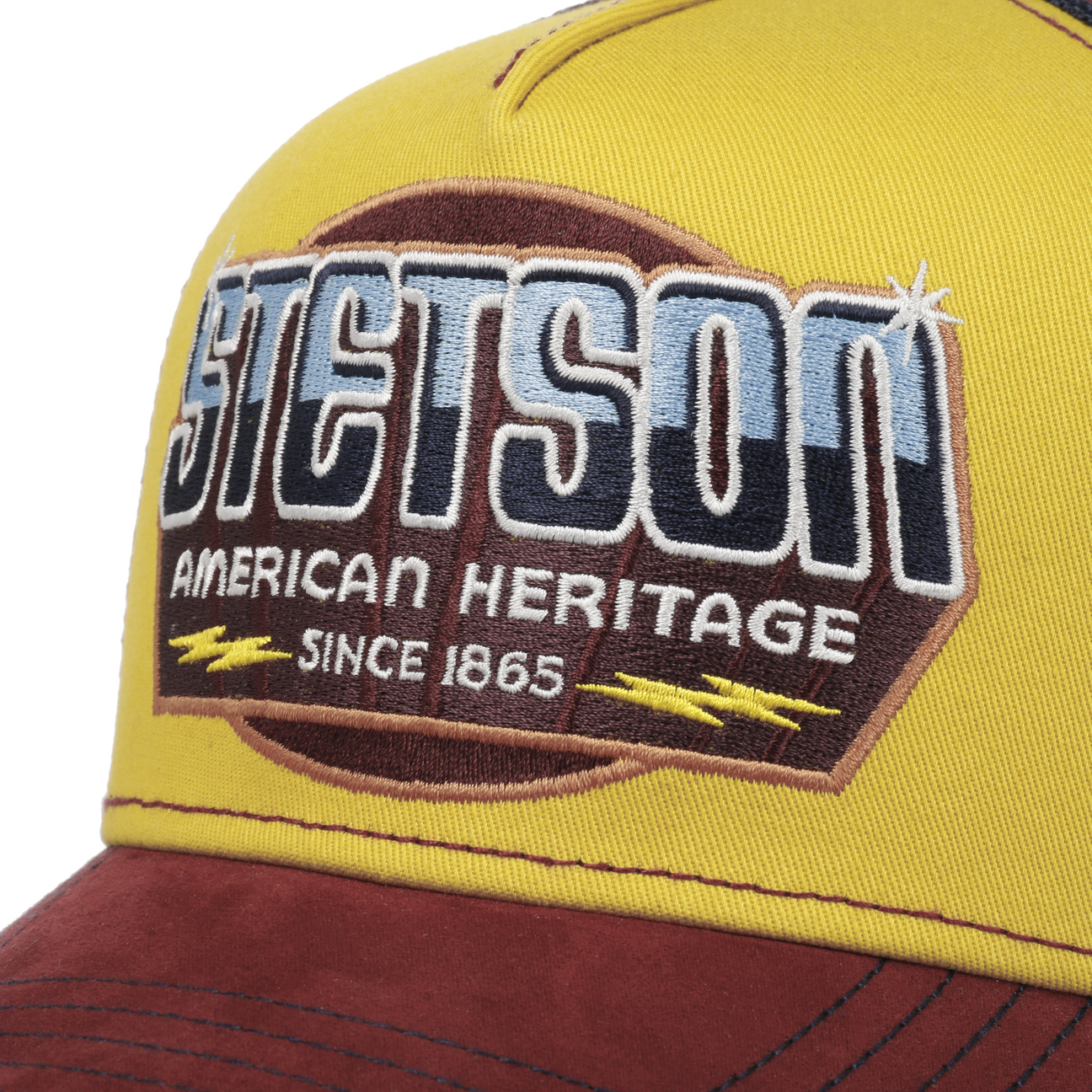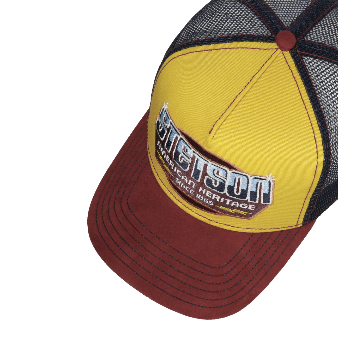 The focus of the design of this trucker cap from Stetson is the large patch that sits right in the centre on the front. Attractively designed details expressively emphasise the brand patch. The cap`s colouring also makes it an eye-catcher. It combines different strong colours. The contrasts emphasise the differences between the materials and give the design a dynamic charisma.