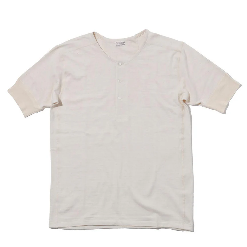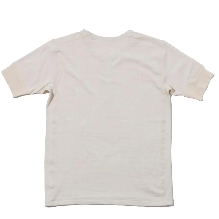 Classic Henley. Ribbed side panels and shoulder seams provide a relaxed fit, while flat seams throughout ensure comfortable wear. The stitching is done with traditional flat seams, making it stress-free to wear. Made of an original round body fabric knitted on a loop-wheel knitting machine. The fabric is slowly knitted over time, giving it the softness of the yarn, and the fabric has a fluffy texture that seems to contain air. Another major characteristic of loop-wheel knitting is that it retains its softness even after repeated washing.